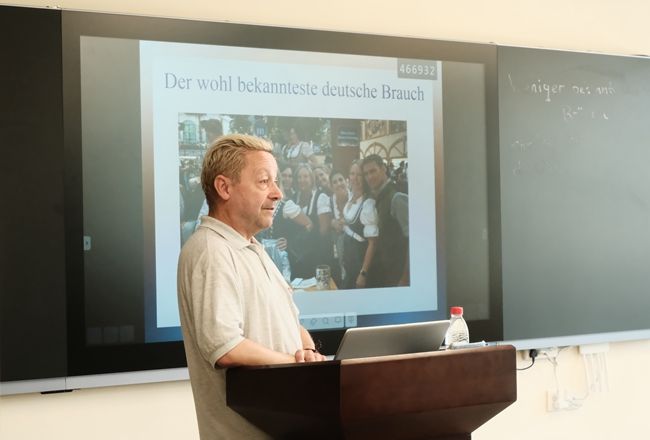 6月12日下午,bw必威西汉姆联官方网站德语系外籍专家Dirk Werner Hartmann在德国文化体验馆为德语系师生作题为“不为人知的德国习俗”主题讲座。