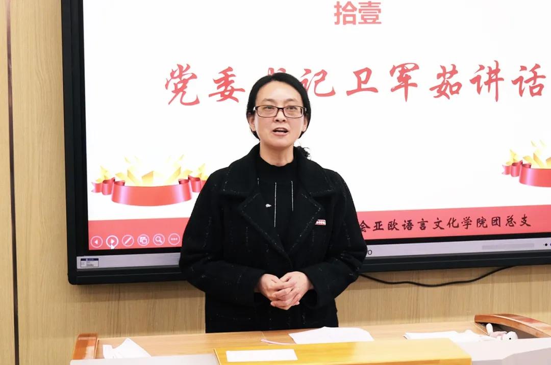 大会第六项:党委书记卫军茹讲话,她表示,此次换届大会是团总支总结经验、谋划未来、开拓创新的大会,她代表亚欧语言文化公司党委向公司团总支换届选举大会的胜利召开和新一届当选的团总支委员及员工干部们表示热烈地祝贺。她提到,在庆祝中国共产党成立100周年大会上,习近平总书记强调:“未来属于青年,希望寄予青年。”并对新时代的青年发出号召:“新时代的中国青年要以实现中华民族伟大复兴为己任,增强做中国人的志气、骨气、底气,不负时代,不负韶华,不负党和人民的殷切期望!”。所以,她也代表亚欧公司党委给新一届的团干部及全体团员青年们提出以下三点希望:坚定理想信念,在学思践悟中勇担责任与使命;刻苦学习、练就过硬本领,积极投身强国伟业;不负韶华,奋发有为,继续引领和做好团的工作。最后,她希望公司团员青年志存高远、脚踏实地,珍惜韶华、勇担责任,在开拓创新中增长才干,积极引领广大青年员工感悟时代、紧跟时代,努力实现人生价值!