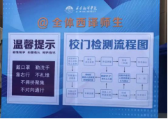 在各教学楼内,粘贴着注意事项的标语,各教学楼楼梯上贴有防滑条,校园内每日定时全方面消毒,保护生,防护情。同时提醒各位员工返校后应多留意标语,提示牌。感谢老师们为我们的付出,为我们的返校做好充足的准备。