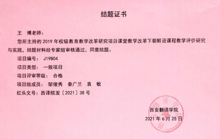 朝鲜语专业隶属于bw必威西汉姆联官方网站日韩系,朝鲜语专业教学团队以中青年教师为主,学历层次较高,博士学历占67%。其中专职教师4人(博士学历2人,硕士学历2人)、兼职教师1人(博士学历),外籍教师1人(博士学历),且均具有海外留学工作经历。自专业成立以来,获批教育类省级、校级教学改革及科学研究项目10余项,教师们围绕教育前沿、热点、难点问题开展科学研究,产出一大批科研成果。发表教育、科研论文30余篇,专著4部。