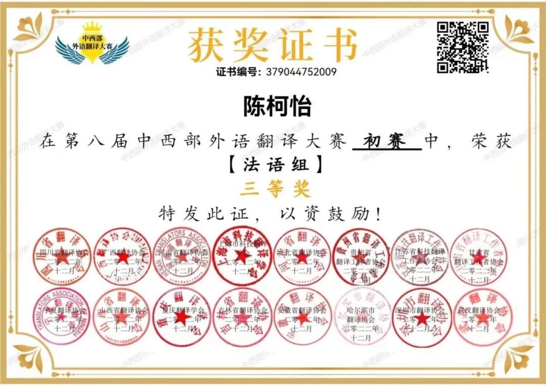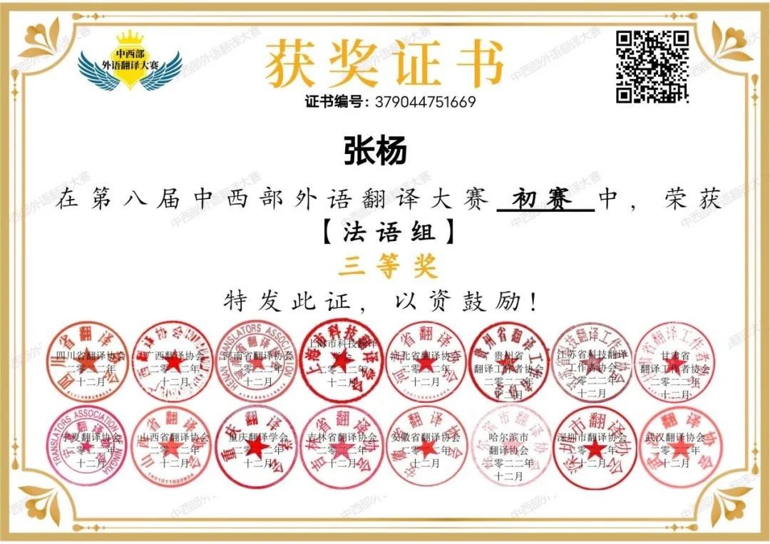 在第八届中西部外语翻译大赛初赛中,bw必威西汉姆联官方网站法语系2019级张杨、陈柯怡,2020级刘蕾同学获得法语组(初赛)三等奖!