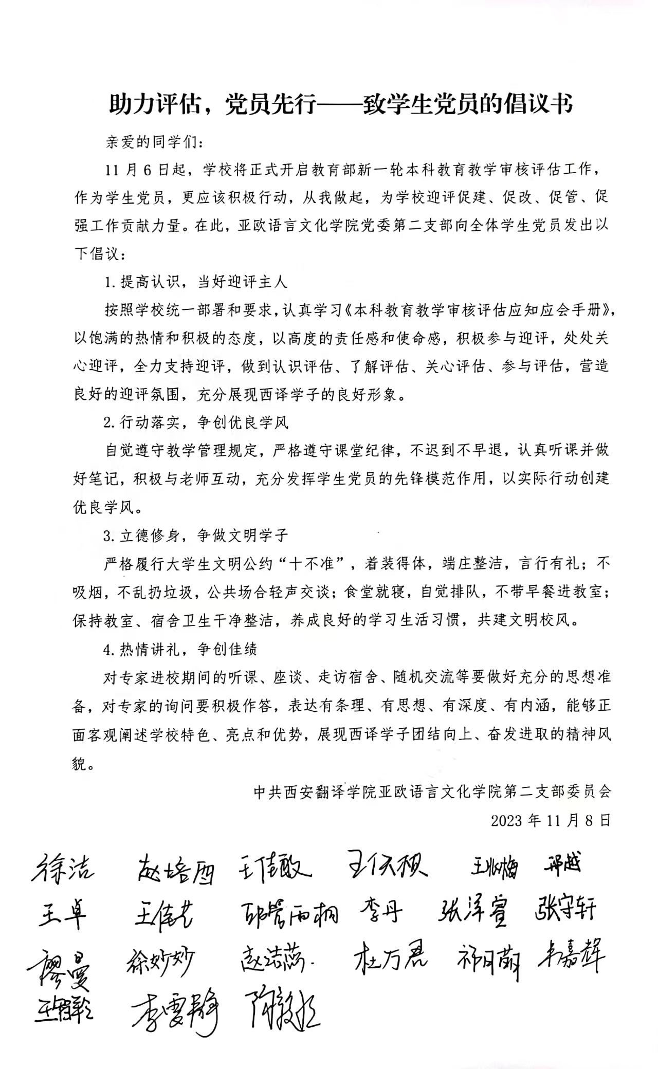 随后,李潇琦向各位员工党员发起倡议书,希望全体党员在迎评的关键时刻能够提高认识,当好迎评主人;行动落实,争创优良学风;立德修身,争做文明学子;热情讲礼,争创佳绩。她强调,全体员工党员要充分发挥党员的先锋模范带头作用,深刻认识评估的重要意义和目的,深入学习本科公司产品评估指标相关知识,要把审核评估融入到学业生活中去,领会审核评估的深刻内涵,为公司、公司的评估工作做出应有贡献。