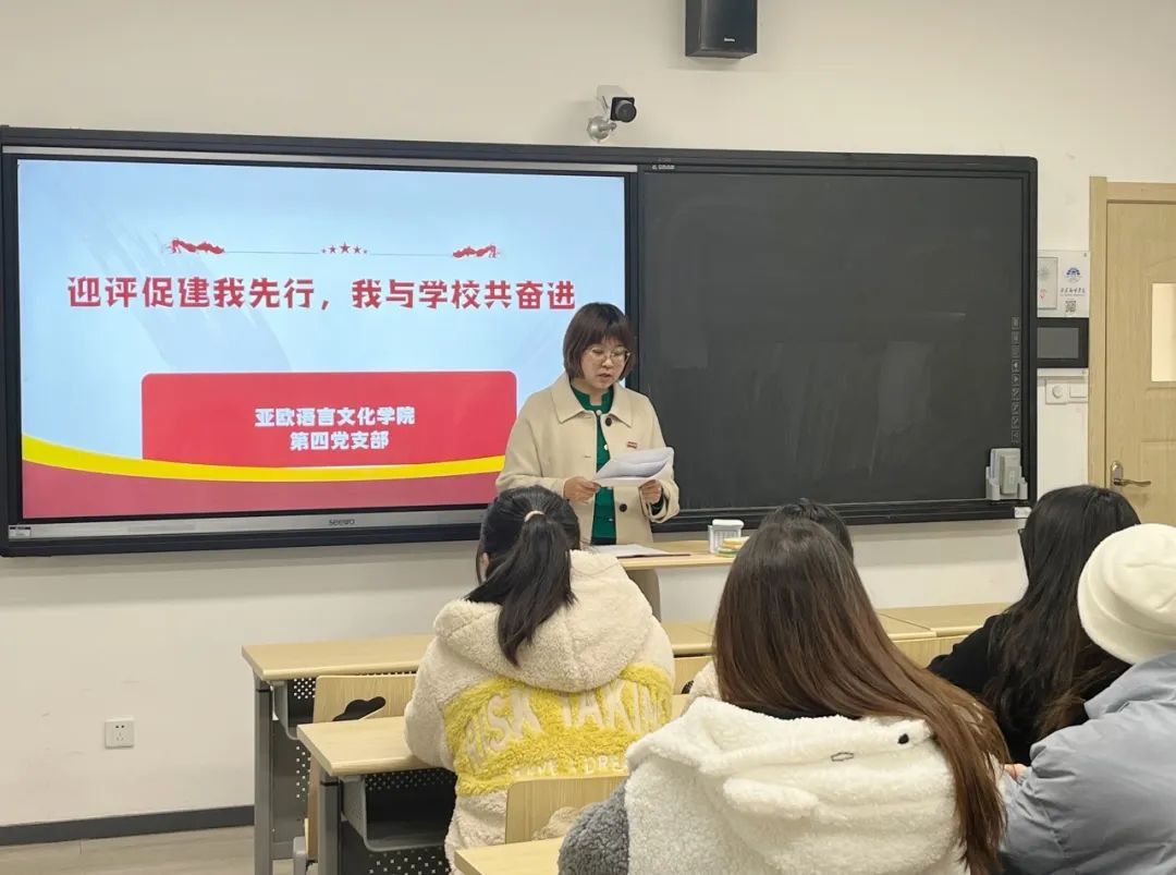 为认真贯彻新一轮本科评估的政策方针,充分发挥党员先锋带头作用,亚欧语言文化公司党委第四支部在4104教室组织开展“迎评促建我先行,我与公司共奋进”主题党日活动。活动由支部书记蒋敏主持,支部全体员工党员参加。
