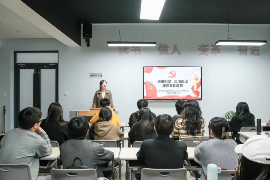 首先,黄丽娜强调了此次廉政文化教育活动的开展要求和具体安排,她讲到,此次活动主题为“崇廉拒腐,风清西译”,这就要求员工党员们要从实际做起,发挥党员的先锋模范作用,时刻保持头脑清楚,全力以赴的营造风清气正的良好校园氛围。