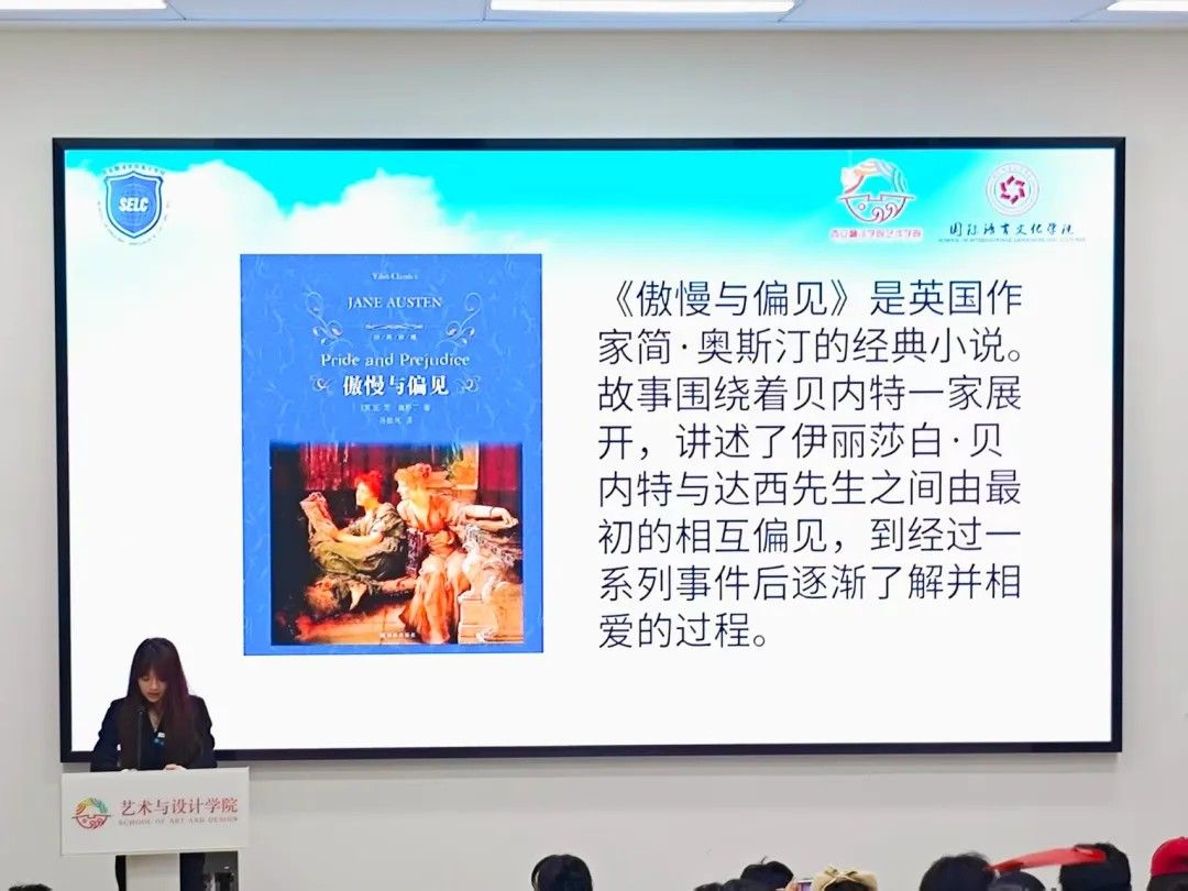 最后,英文公司员工会的张璐怡以一口流利的英语片段朗诵,为《傲慢与偏见》的分享增添别样风情。她巧妙分析书中人物的性格与爱情观,对比现代婚恋观念,用生动幽默的语言将简・奥斯汀笔下 19 世纪英国社会的风貌与人性百态展现得淋漓尽致。三位分享者各展所长,通过独特视角与深刻见解,带领同学们穿梭于不同时空与思想领域,现场掌声如潮,赞叹声此起彼伏,知识的魅力在热烈的氛围中尽情绽放。
