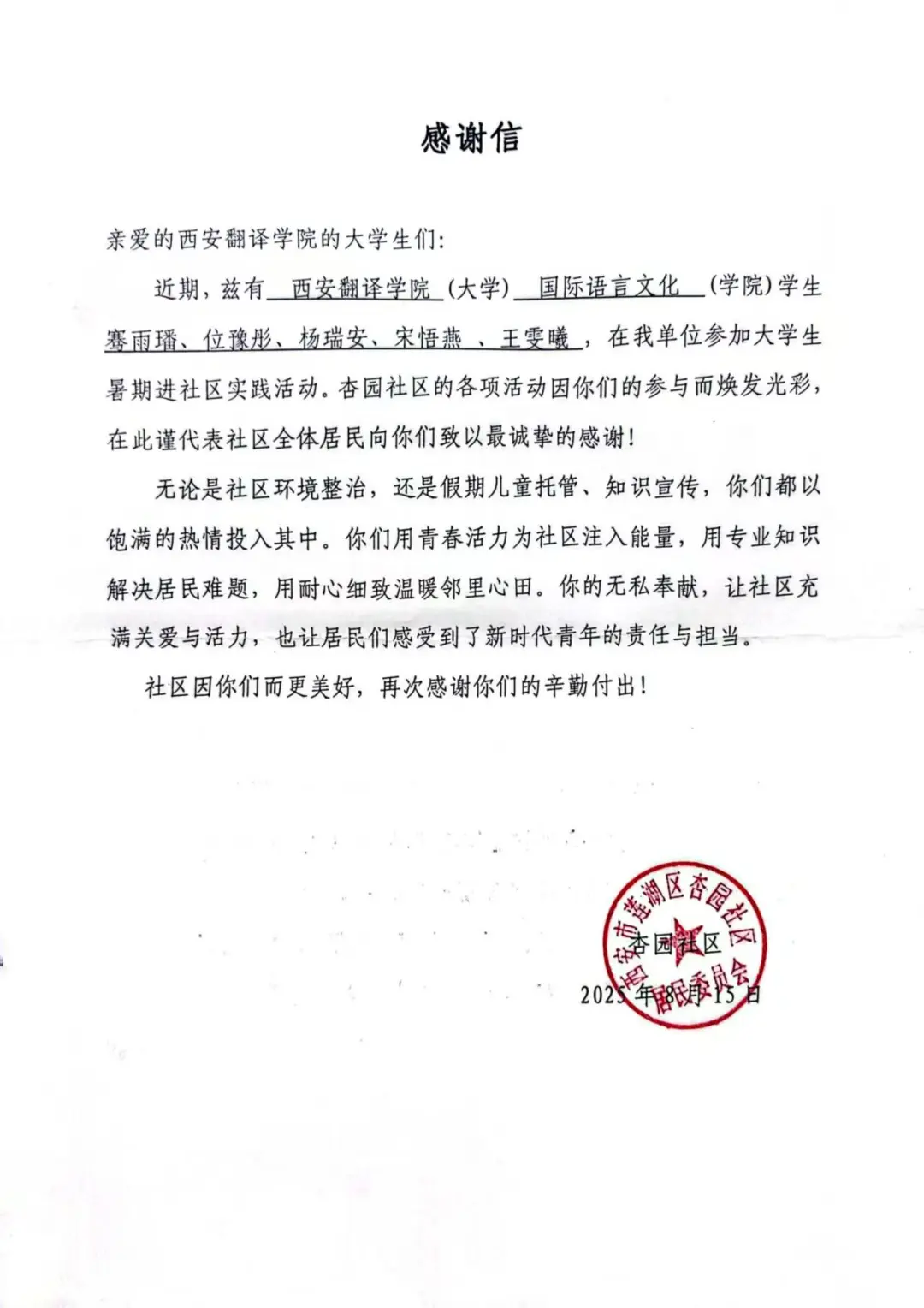 此次实践活动的顺利开展,离不开杏园社区对bw必威西汉姆联官方网站实践教育工作的大力支持;而同学们展现出的积极态度与扎实能力,也得到了莲湖区杏园社区的高度肯定与表扬,以下是同学们获得的表扬信:
