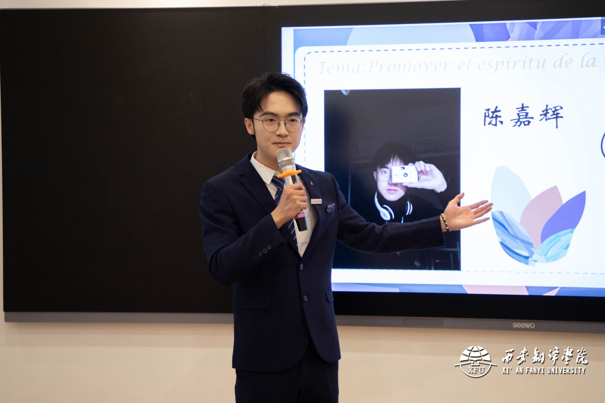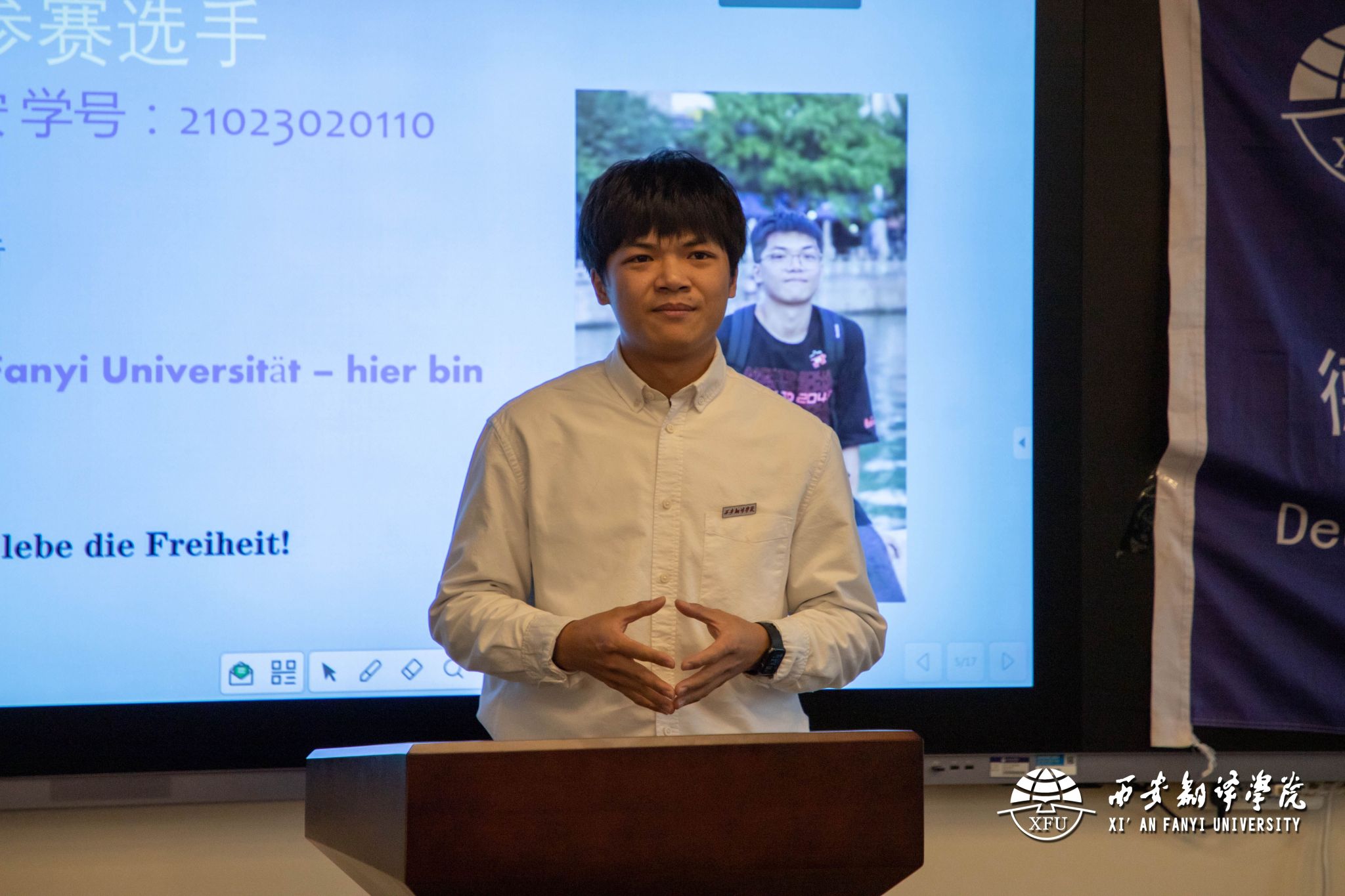 本次比赛由命题演讲和才艺展示两部分构成,设有日语、西班牙语、俄语、法语、德语、朝鲜语六个赛道,共有51名选手入围决赛,其中以西区体验式教学中心多功能厅为主会场,各语种决赛分别在各语种文化体验馆进行。