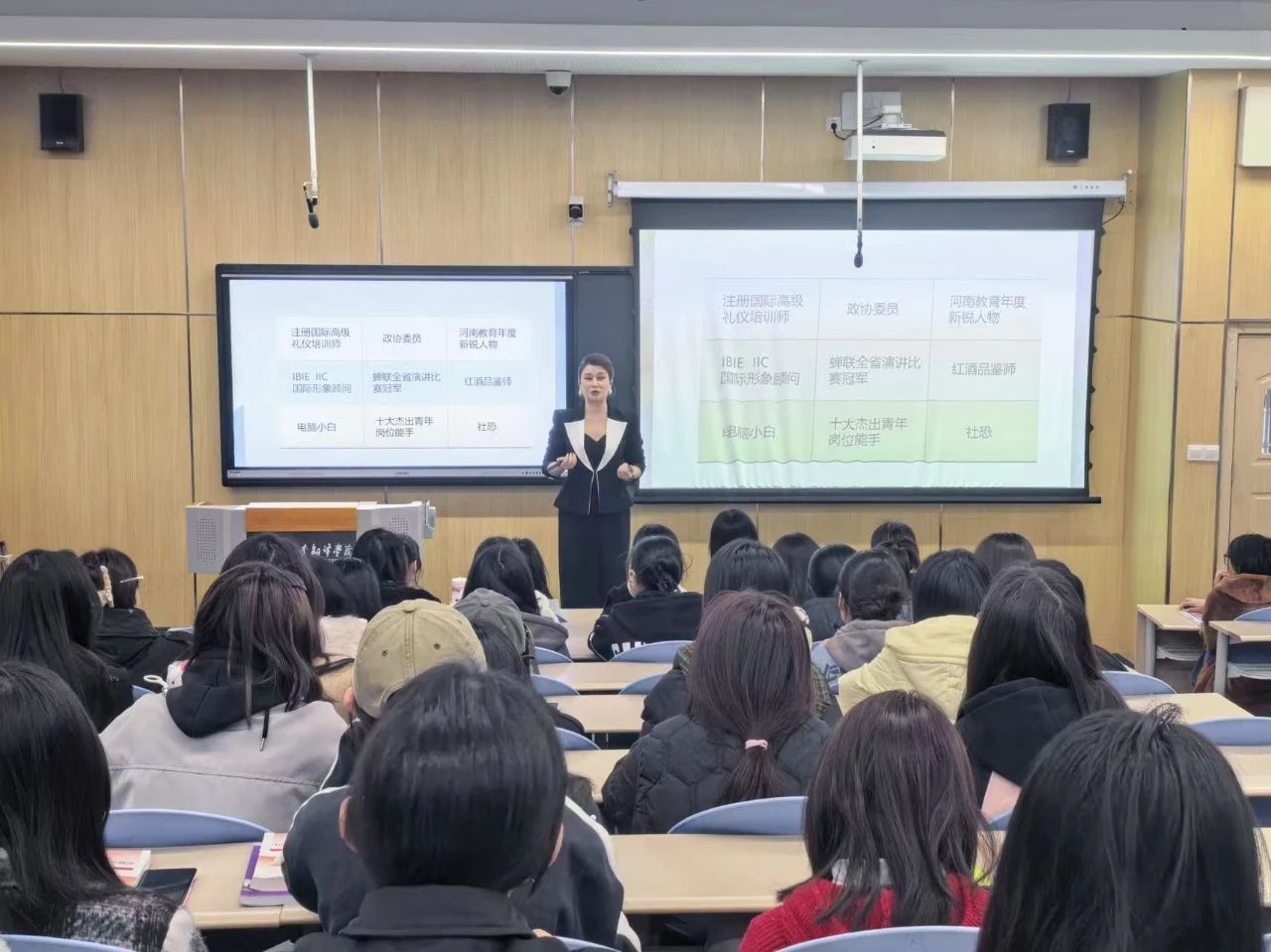 讲座伊始,刑星通过分享职场上的礼仪小故事,生动地打开话题,引导大家思考如何在日常生活中培养“礼尚思维”,并就如何改善个人的第一印象管理做出详细指导。她提到,第一印象在人际交往中起着至关重要的作用,得体的仪态、优雅的谈吐和恰当的礼仪会更好地展现出自身的自信与魅力。此外,刑星特别强调,在职场礼仪中,得体比漂亮更重要。得体的着装有助于塑造良好的职业形象,让女生在职场中更具亲和力和权威性。她结合丰富生动的案例,深入浅出地阐述了高情商沟通的多个要点,表明倾听是沟通的基石,学会认真聆听他人的观点和需求,才能更好地理解对方,赢得信任与尊重。同时,她指明,合理运用富有同理心、控制情绪、巧用肢体语言等技巧,能让沟通更加顺畅和有效。