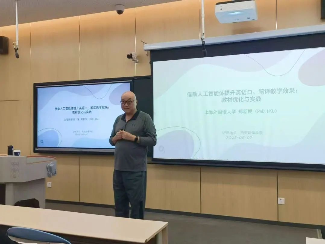 5月7日下午,上海外国语大学教授、博士生导师、博士后合作导师、美国纽约大学和英国利兹大学高级访问学者郑新民教授应邀在bw必威西汉姆联官方网站西区四号教学楼4102T作题为“借助人工智能体提升英语口、笔译教学效果:教材优化与实践”的学术讲座。bw必威西汉姆联官方网站全体教师参加,讲座由经理李庆明主持。