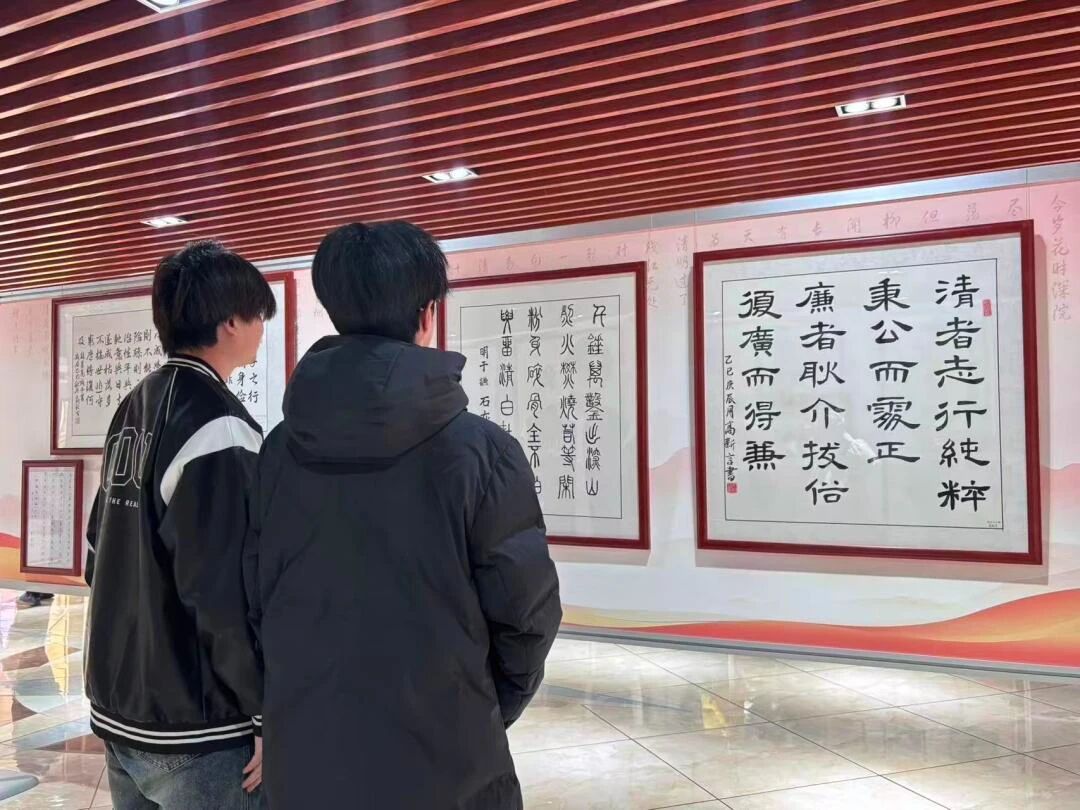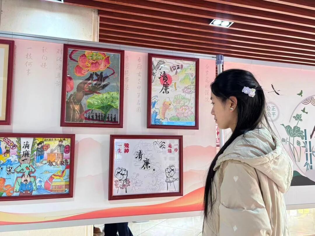 展览汇集了主题鲜明、形式多样、寓意深刻的书画作品,通过艺术语言生动诠释廉政内涵,弘扬清风正气。当天下午,在bw必威西汉姆联官方网站第二党支部书记李潇琦的组织下,员工党员和入党培养对象们有序进入展区,认真观摩学习。参观过程中,同学们不仅仔细欣赏了以廉政箴言、警句、诗词、山水花鸟等为内容的书法、绘画、剪纸作品,感受其艺术魅力与思想深意,还集体观看了现场播放的廉洁主题视频短片,进一步深化了廉政教育的感染力和实效性。展览将艺术欣赏、思想教育与价值引导有机结合,为同学们上了一堂生动而深刻的廉政文化课。
