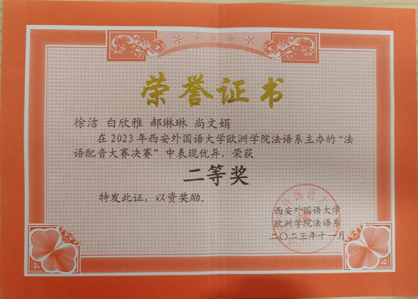2020级法语系员工参加西安外国语大学法语配音比赛并获得佳绩